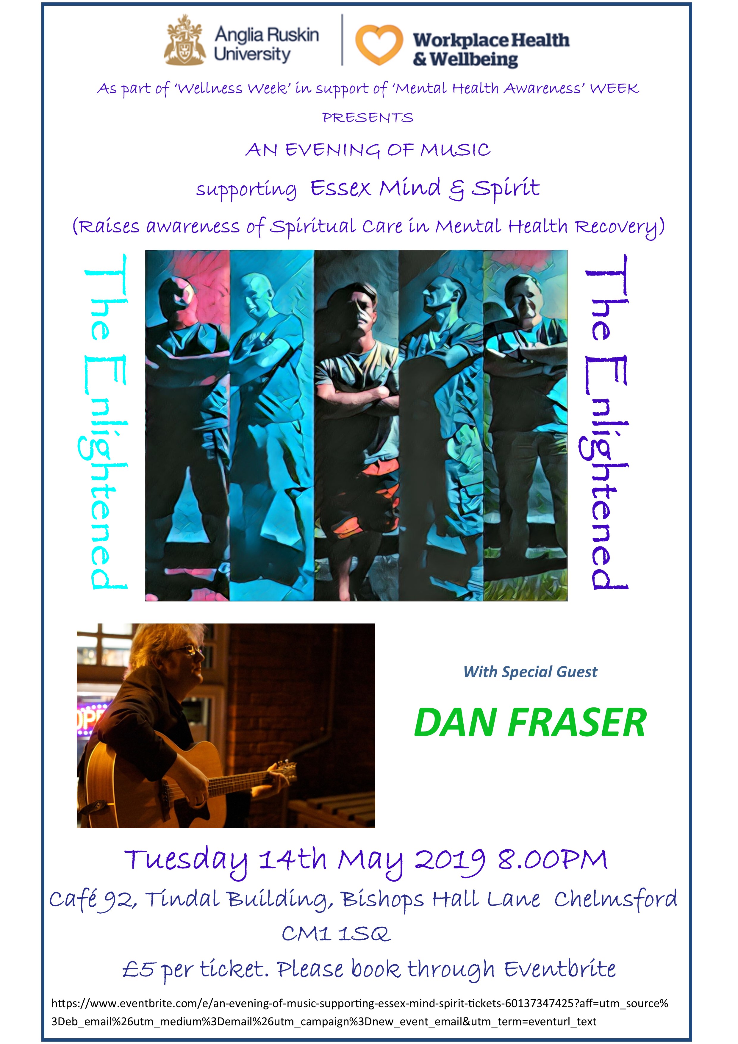 As part of 'Wellness Week' in support of 'Mental Health Awareness' Week, presenting an evening of music supporting Essex Mind & Spirit to raise awareness of spiritual care in mental health recovery with special guest Dan Fraser
